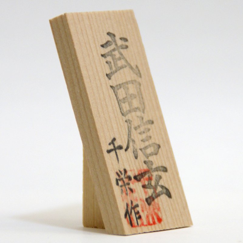 He is created by Chie Tamura and his title is SHINGEN TAKEDA. This item is 15.5cm (6.1 inches) tall and weighs about 280g (0.62 lb) after packing. This item is made of Mizuki wood and hand-painted and the title name plate is included.